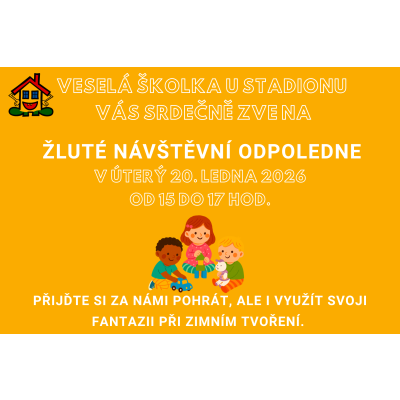 Veselá školka U Stadionu vás srdečně zve na ŽLUTÉ NÁVŠTĚVNÍ ODPOLEDNE, které se uskuteční v úterý dne 20. ledna 2026 od 15 do 17 hod. Přijďte si za…