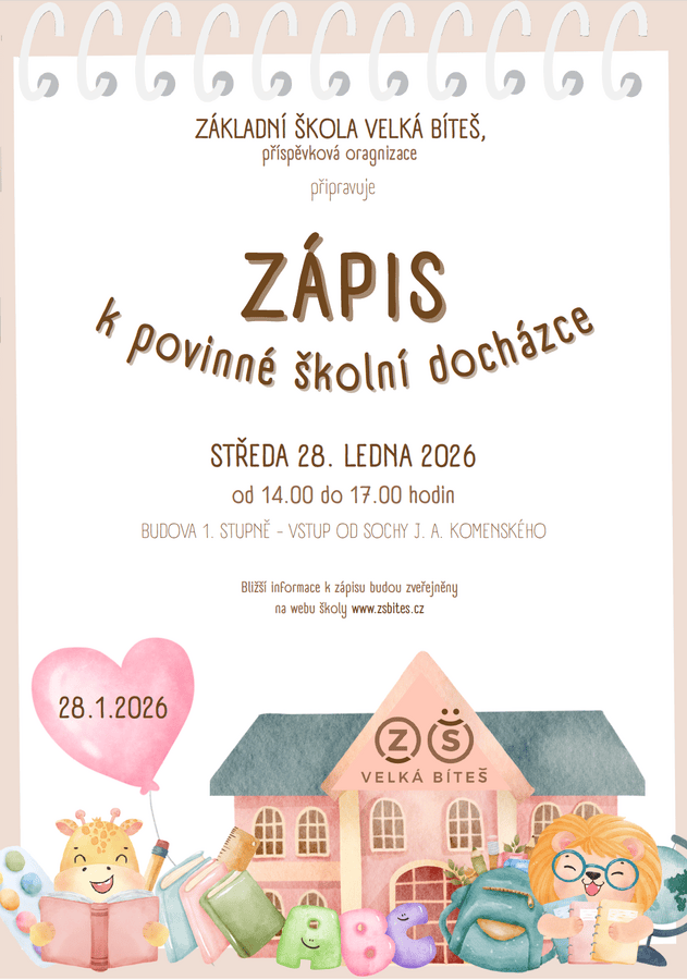 Více informací naleznete na stránkách školy: https://www.zsbites.cz/informace-vedeni-skoly/2575-zapis-k-povinne-skolni-dochazce-pro-skolni-rok-2026-2027